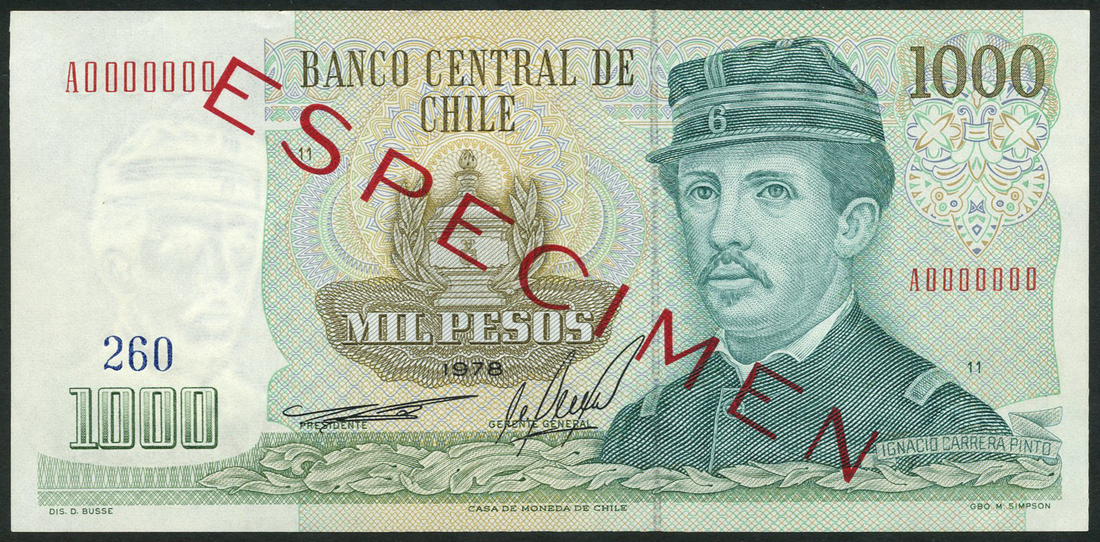 Banco Centrale de Chile, specimen 1000 pesos, 1976, zero serial number, dark grey on multicolour underprint, 500 pesos, 1977, serial number A0000000, brown on multicolour, 1000 pesos, 1978, serial number A0000000, green, the notes feature portraits of Diego Portales, Pedro of Valdivia and Ignacio Carre Ra Pinto respectively