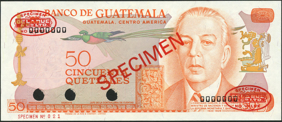 Banco de Guatemala, specimen 1/2 quetzal (4), ND (ca 1964), brown, the Hermitage of Cerro del Carmen at right, also specimen 20 quetzals (2), ND (1965), blue, Landivar at right, also specimen 50 quetzals, ND (1967), orange and blue, Orellana at right, also 50 quetzals, ND (1974), orange, Zachrisson at right