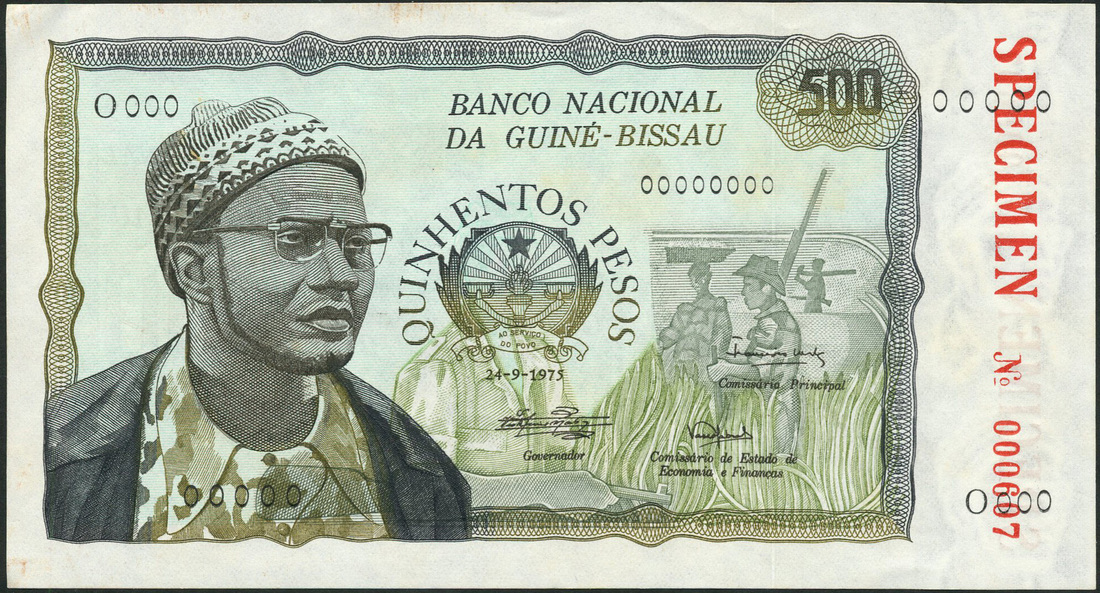 Banco Nacional da Guine Bissau, a specimen set of the 24 September 1975, all zero serial numbers, comprising 50, pale blue, 100, brown and 500, green, Nalsna, Ramos and Cabral portraits respectively