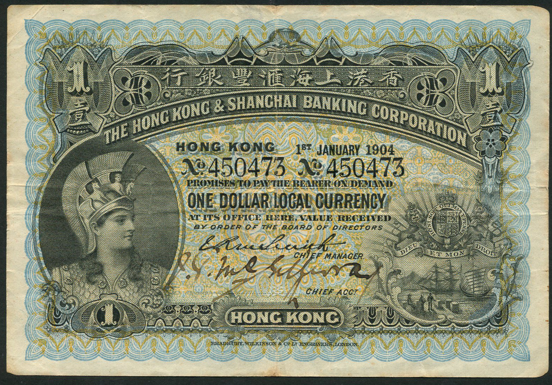 Hong Kong and Shanghai Banking Corporation, $1, 1 January 1904, serial number 450473, blue and orange, head of Minerva at left, arms art right, printed signature of Smith low centre, manuscript signature below, reverse red, maiden with lyre at centre