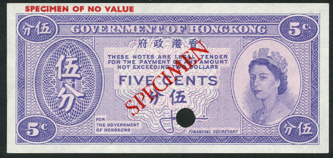Government of Hong Kong, colour trial 5 cents, ND (1961), mauve, Elizabeth II at right, value at left, Cowperthwaite signature, reverse blank