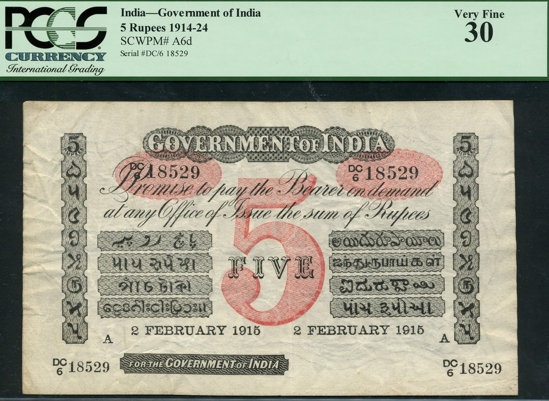 Government of India, 5 rupees (3), A (Cawnpore), 2 February 1915, serial number DC/6 18529/18530/18531, black and white, value in pink at centre,