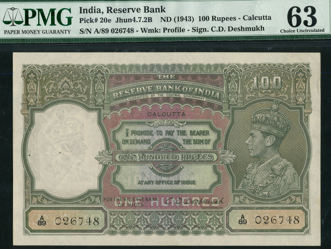 Reserve Bank of India, 100 rupees (2), ND (1943), Calcutta, consecutive serial numbers A/89 026747/8, olive green on multicolour underprint, portrait King George VI at right, bank title top centre, value in ornate tablet at centre and top right, reverse, tiger at centre
