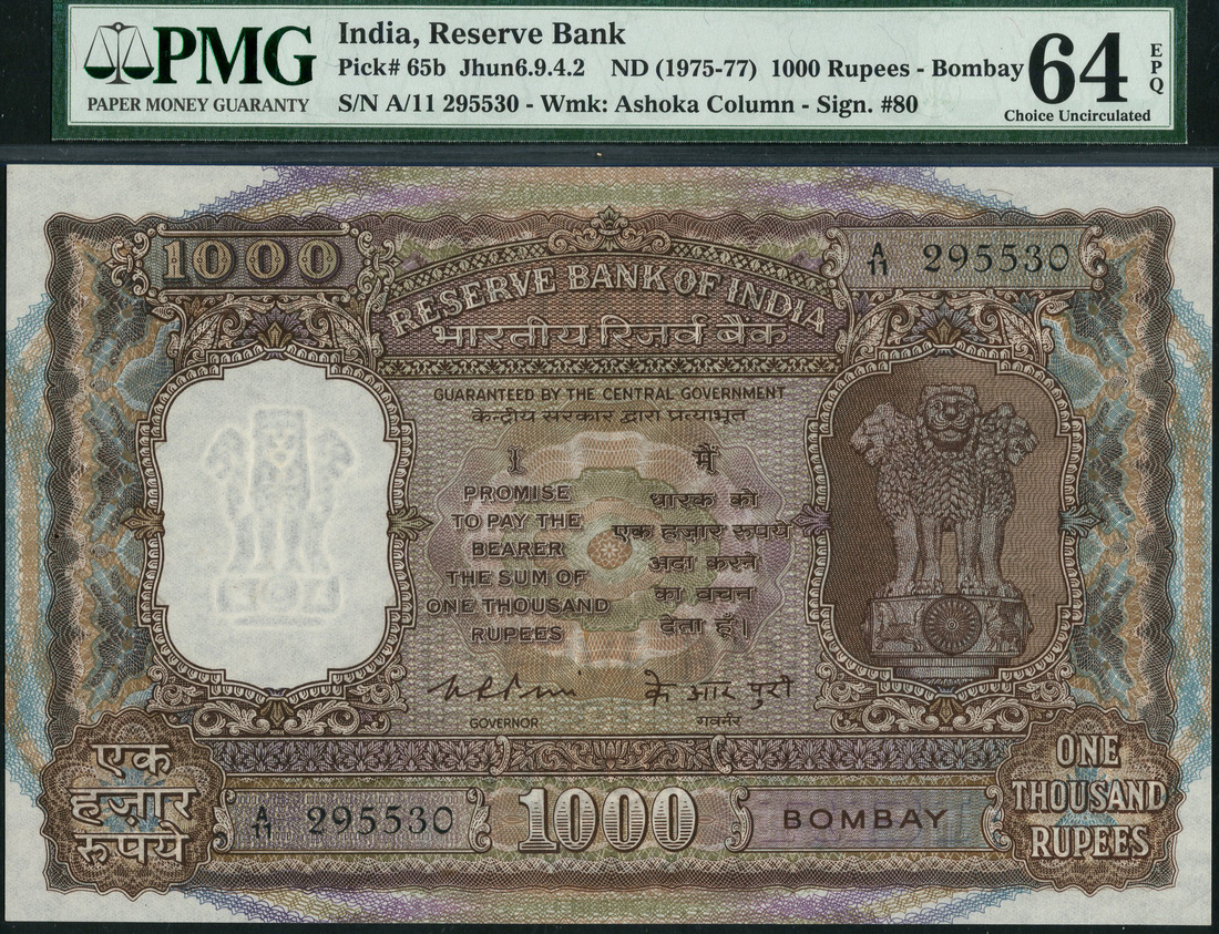 Reserve Bank of India, 1000 rupees (5), ND (1975-77), consecutive serial numbers A11 295526/30, brown on multicolour underprint, asoka column in ornate frame at right, bank title top centre in English and Hindi, value in three corners and low centre, BOMBAY low centre right