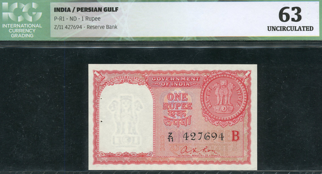 Government of India, Gulf Issue, 1 rupee, ND (1957-66), serial number Z11 427694, red, coin with Asoka column top right, bank title top centre, Roy signature, reverse, coin with value top left