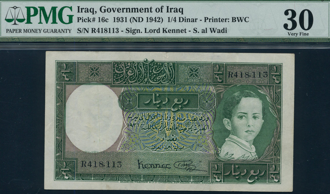 Government of Iraq, 1/4 dinar, 1931 (1942), serial number R 418113, green, King Faisal II as a child at right, Kennett and al Wadi signatures
