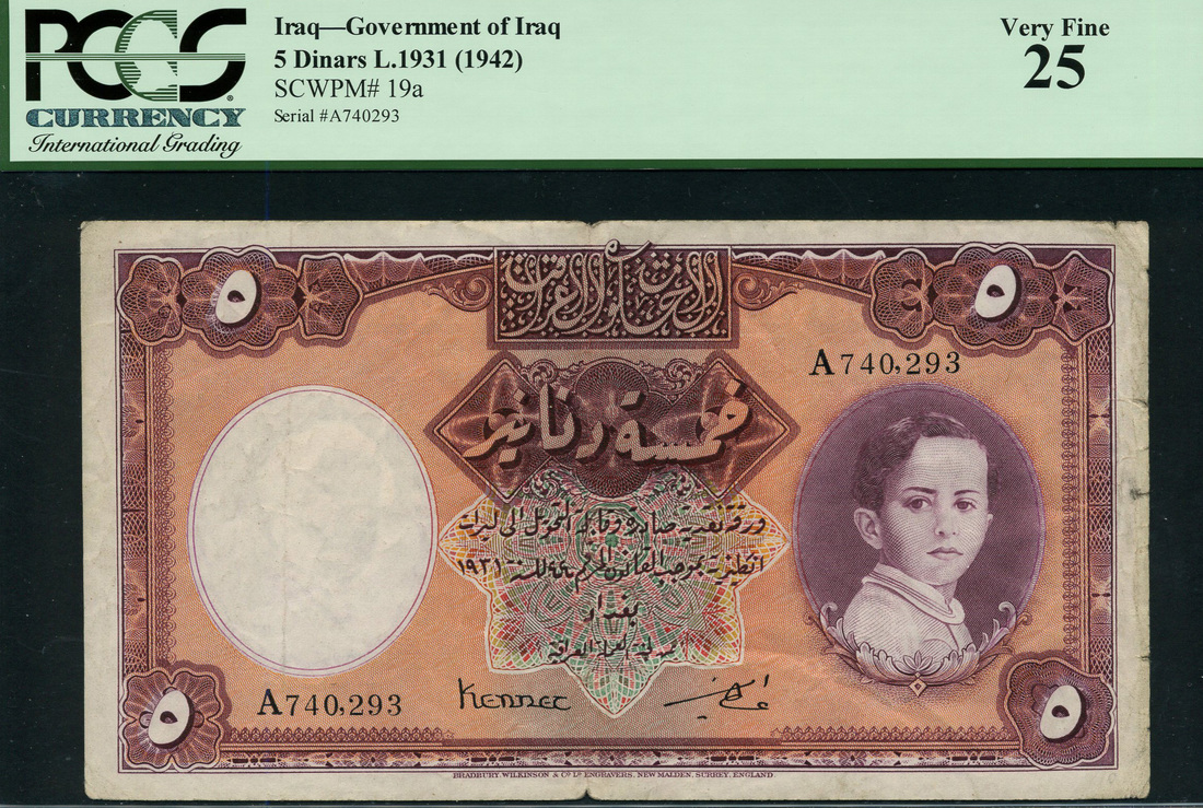Government of Iraq, 5 dinars, Baghdad, law of 1931 (1942), serial number A 740293, purple, pink and lilac and blue-green, King Faisal II as a child at right, value at each corner, signatures of Kennet and Ata Amin, reverse purple and white, value in field