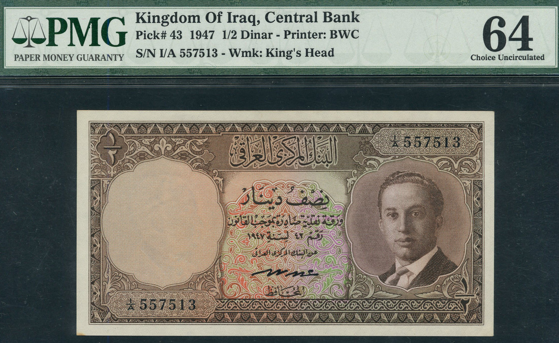 Central Bank of Iraq, 1/2 dinar, 1947, serial number I/A 557513, brown and multicoloured, King Faisal II as a young man at right, Abdul Ilah Hafudh signature