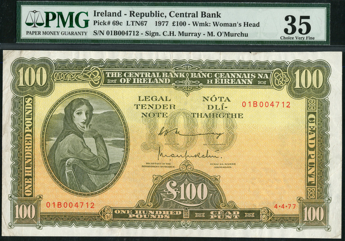 Central Bank of Ireland, £100, 4 April 1977, serial number 01B004712, olive green on light yellow and orange underprint, portrait Lady Lavery in circular frame at left, bank title top centre, value repeated through the ornate border, reverse, river god in elaborate panel at centre
