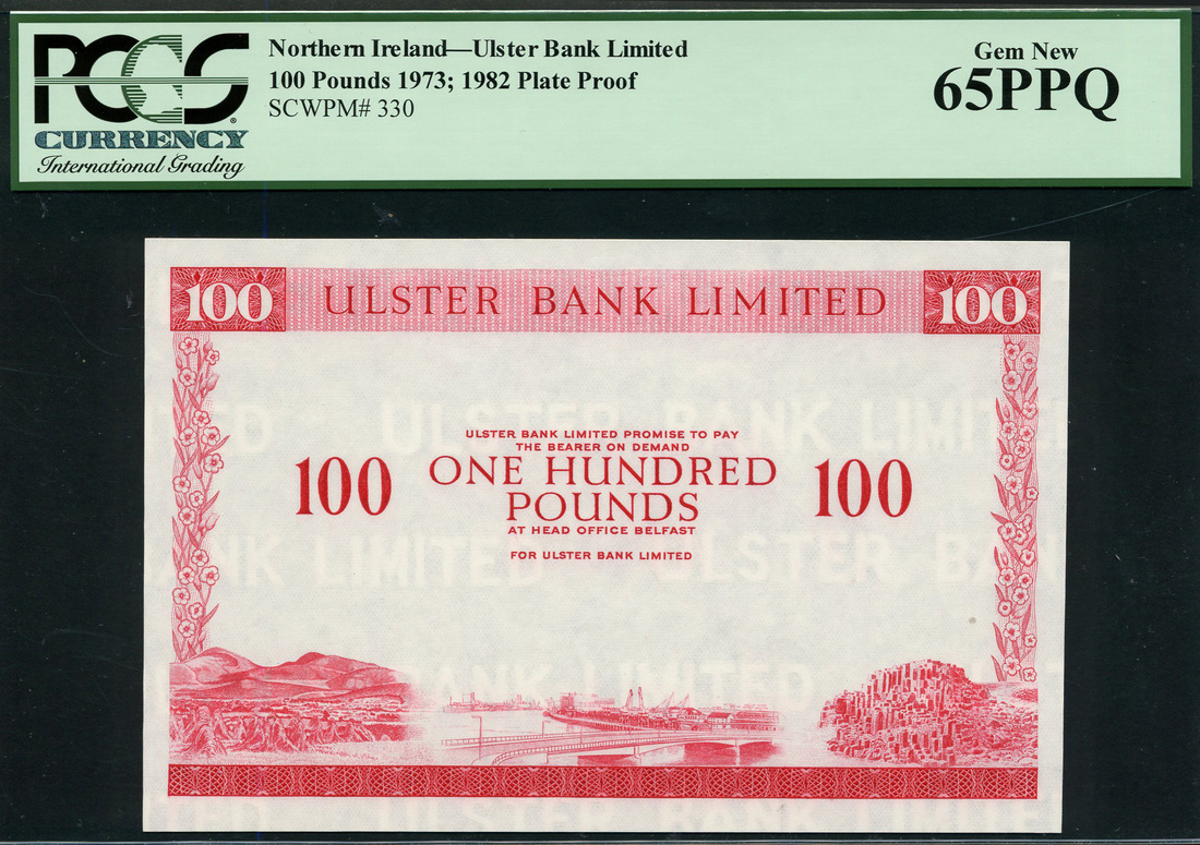 Ulster Bank Limited, a selection of three partial die proofs comprising £10, 1966, green and white, £20, 1970, purple and white and £100, ND, red and white