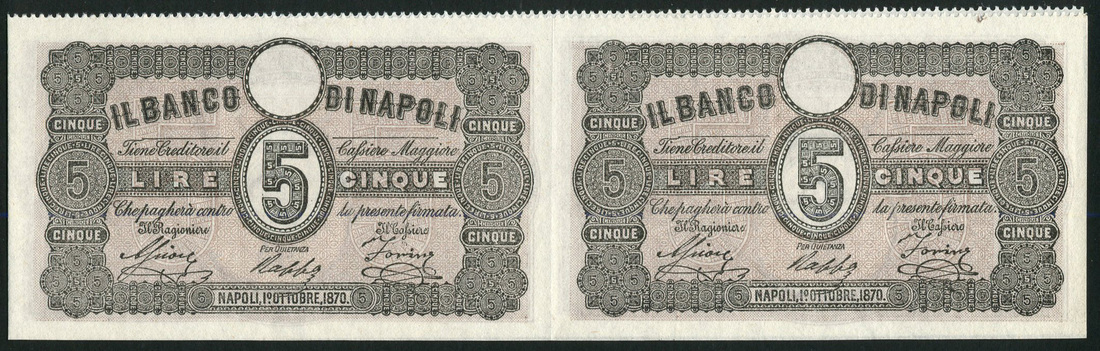 Banco di Napoli, Italy, a strip of four 5 Lire, Napoli, 1 October 1870, no serial numbers, five signatures, black on brown underprint, value at centre and in each corner, reverse brown, value at centre, male medallic heads at left and right