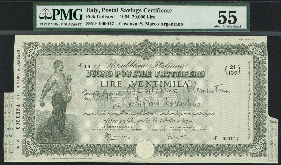 Postal Savings Certificate, Italy, 10,000 lire, 1954, serial number 000041, 20,000 lire, 1954, serial number 000017, grey-green on pale lilac underprint, farmer at left, ornate border,