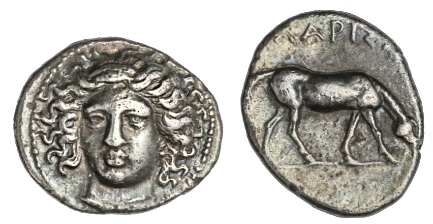 Thessaly. Larissa. AR Drachm, ca. 400-380 BC. Head of the nymph Larissa facing ¾ left, hair in ampyx, wearing necklace, rev. ΛAPI, horse grazing right on solid exergual line. Lorber 79.2, Hermann pl. VII, 17. Attractive deep slate gray with pearly hues. Good Very Fine.
