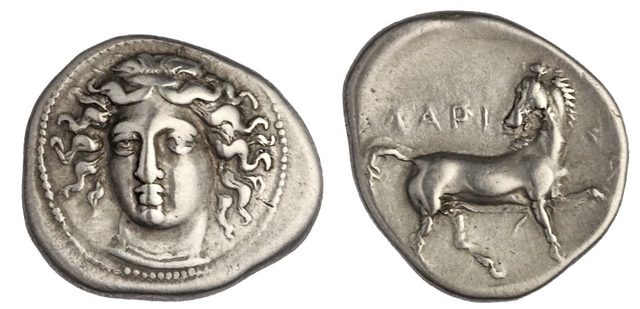 Thessaly. Larissa. AR Drachm, ca. 400-380 BC. 6.07 gms. Head of the nymph Larissa facing ¾ left, hair in ampyx, wearing necklace, rev. ΛAPI-ΣA, horse prancing right, head turned left. Lorber-Shahar O2 [R1 of O1] = Lorber, Early 31/30.2 corr. (rev. legend). An attractive and extremely rare reverse type. Very Fine. Ex CNG Sale 79, Sept. 17, 2008, lot 188.