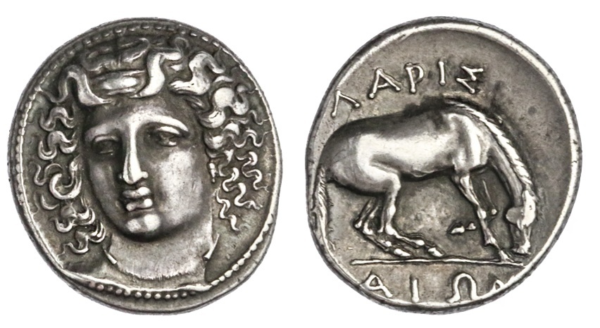 Thessaly. Larissa. AR Drachm, ca. 365-356 BC. 6.08 gms. Head of the nymph Larissa facing ¾ left, wearing ampyx and necklace, its endlines tapered out from neck, rev. ΛAPIΣ-AION, horse about to roll right, its rump and back legs lowering. Lorber Hoard phase L-II, 27-37. Lovely battleship gray tone with pearlescent highlights. Fine style. Near Extremely Fine. Ex CNG Sale 75, May 23, 2007, lot 159.