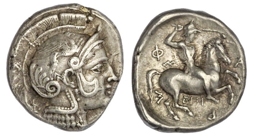 Thessaly. Pharsalos. AR Drachm, late Fifth-early Fourth Century BC. 6.05 gms. Magistrate: EPI-. Head of Athena right wearing crested helmet, its bowl decorated with a springing griffin, E behind neck guard, rev. Φ-A-P-Σ around warrior astride horse right, wearing petasos and wielding a mace, EΠI below. Lavva 163var, HGC 4, 627. Good Very Fine.