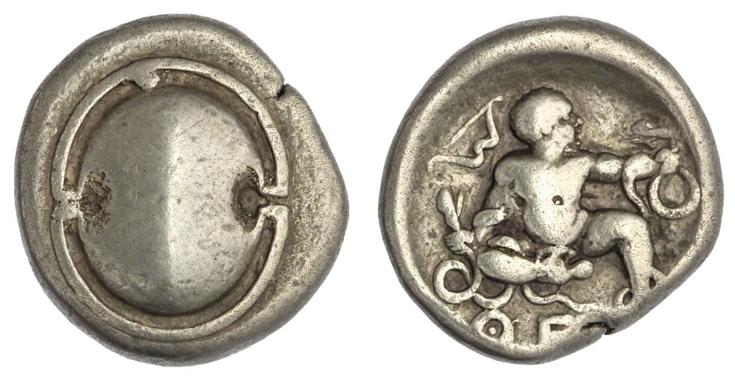 Boeotia. Thebes. AR Stater, ca. 425-395 BC. 11.92 gms. Boeotian shield, rev. The infant Herakles seated facing, strangling a serpent in each hand, bow above left, ΘE below; all within incuse circle. Boiotia 456 (same reverse die), SNG Copenhagen 303 var. Rare. Light gray. About Very Fine.
