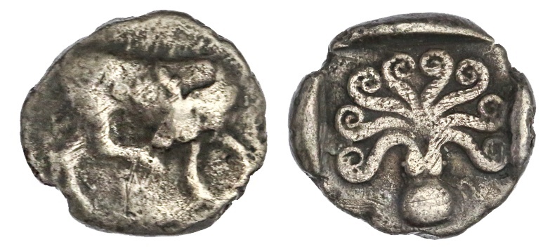 Euboia. Eretria. AR Drachm, ca. 500-465 BC. 3.35 gms. Cow standing right, scratching its head with its hind foot, rev. Octopus within incuse square. SNG Copenhagen 470. Rare. Typical somewhat shallow obverse strike. Toned. About Very Fine.