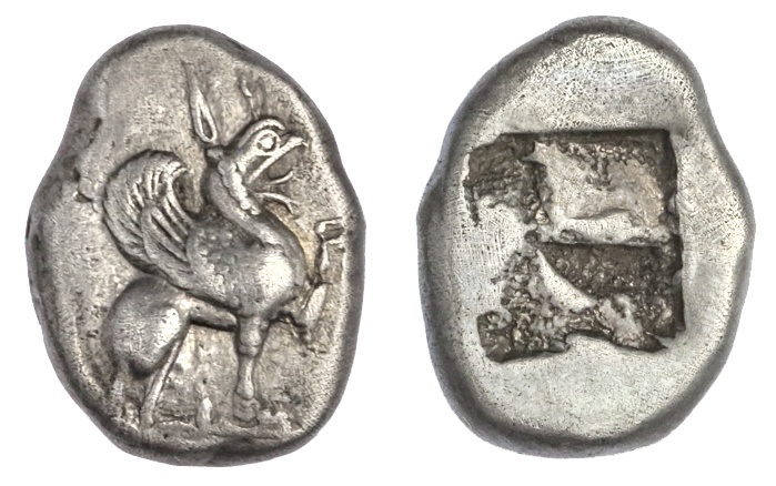 Ionia. Teos. AR Drachm, ca. 510-500 BC. 5.97 gms. Griffin seated right, raising forepaw, rev. Incuse square punch. Balcer group XX (unlisted dies). Very pleasing archaic style. Good Very Fine.