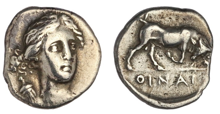 Islands off Ionia. Ikaros. Oinoe. AR Drachm, ca. 340-300 BC. 3.43 gms. Head of Artemis, quiver over shoulder, facing ¾ right, rev., Bull butting right, OINAI in ex. SNG Kayhan 627, SNG V. Aulock 8023. Very rare. Light gray. Very Fine. Ex CNG Sale 69, June 8, 2005, lot 442.