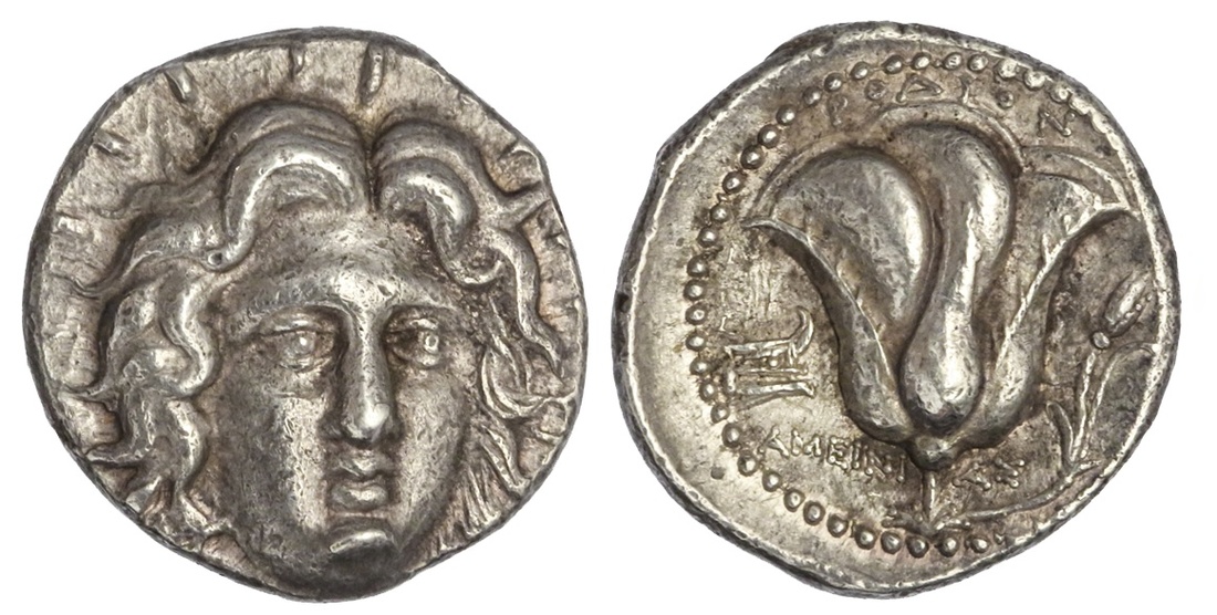 Islands off Caria. Rhodes. AR Tetradrachm, ca. 229-205 BC. 13.55 gms. Magistrate: Ameinias. Radiate head of Helios ¾ right, rev. PoΔIoN above rose with bud, prow behind, AMEIN-AΣ below, all within beaded circle. Ashton 212, SNG Keckman 542, SNG v. Aulock 2799, SNG Copenhagen 759, BMC 134. Attractive high-relief and toning. Nice style. Extremely Fine.