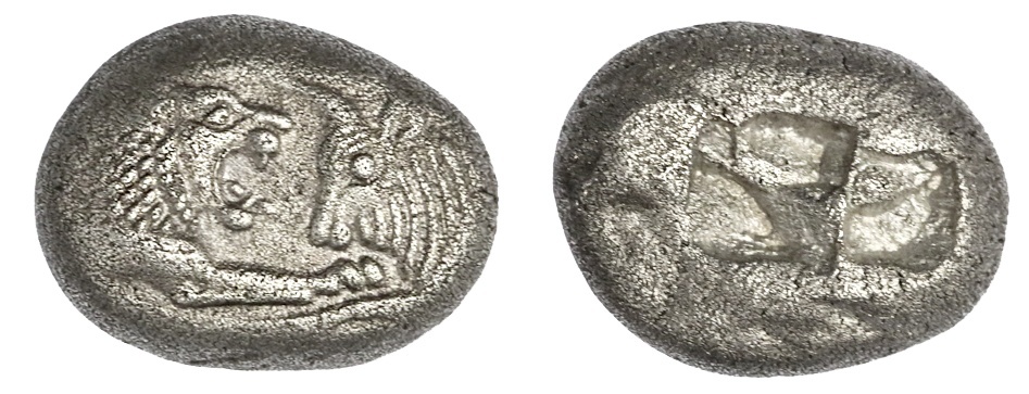 Kings of Lydia. Kroisos (564/553-550/539 BC). AR Stater - Double Siglos. Sardes mint. 10.23 gms. Confronted foreparts of a roaring lion at right and bull left, rev. Two incuse punches of unequal size. Traité I, 407, SNG Kayhan 1018, SNG Copenhagen 455, SNG von Aulock 2874, SNG Ashmolean 760. Pale gray toning over somewhat granular surfaces. Choice Very Fine. Ex Coin Galleries Sale, March 2008, lot 2068.