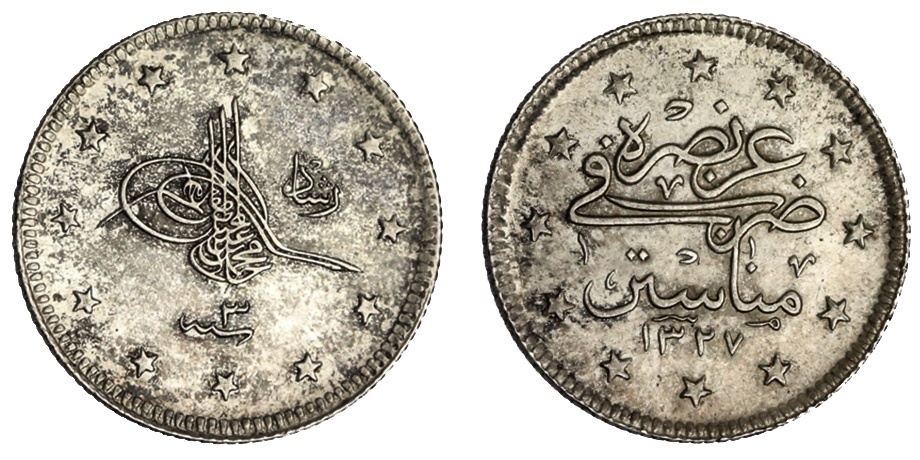 Turkey. Ottoman. Mehmet V (AH 1327-1336/1909-1918 AD). 2 Kurush, Manastir, accession AH 1327, year 3. On the Sultan's Visit to Manastir. Toughra, reshad before, year below, in border of stars, rev. Within border of stars: `azz nasrahu fi Manastir and date. KM 802. Rare. Uncirculated.