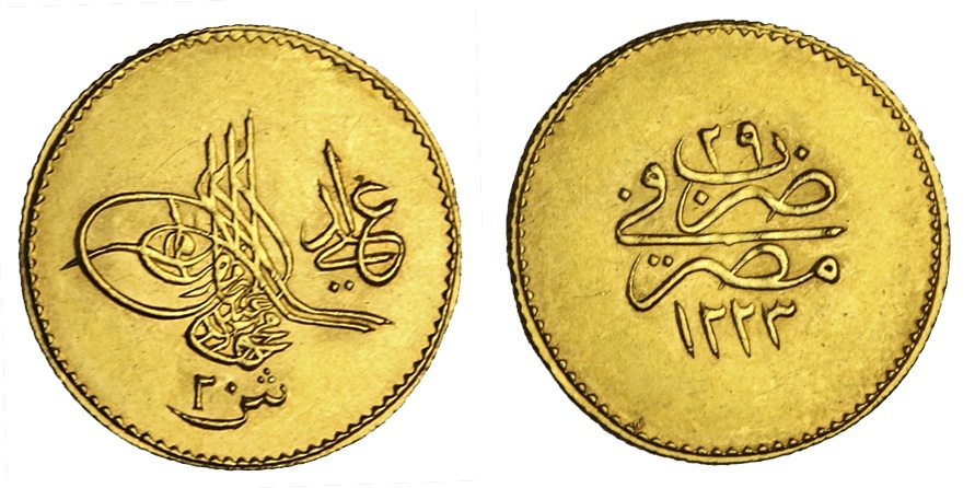 Egypt. Ottoman. Mahmud II (AH 1223-1255/1808-1839 AD). Gold 20 'Irsh, Misr, accession AH 1223, year 29. 1.74 gms. Toughra, `adli before, value below, rev. Year, mint and date. KM 215. Rare. Choice Extremely Fine.