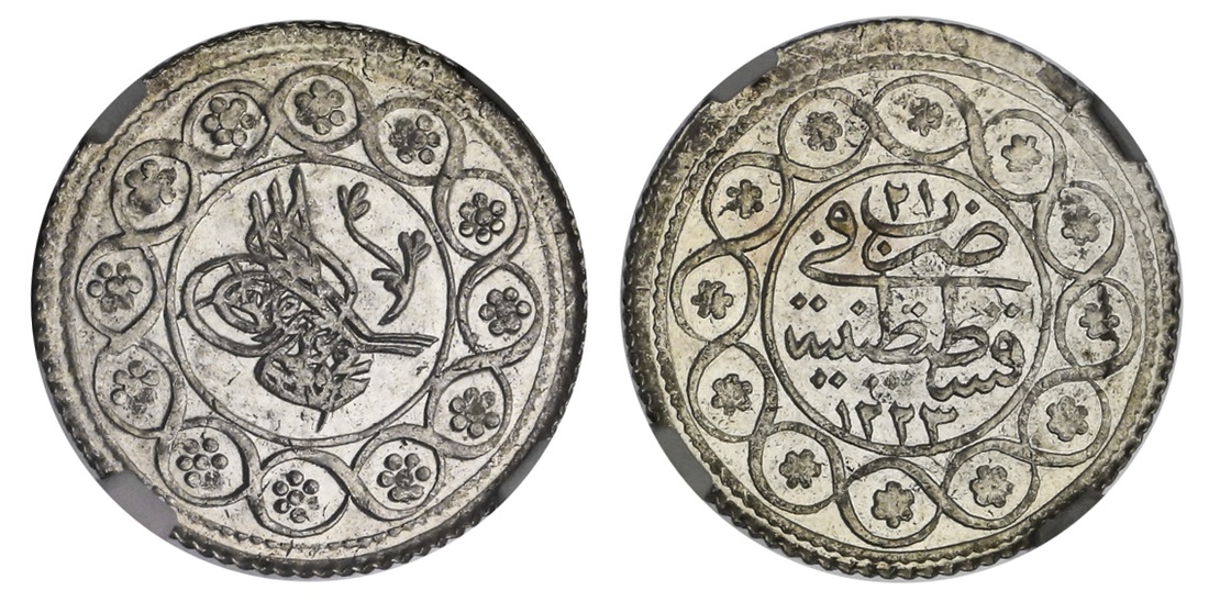 Egypt. Ottoman. Mahmud II (AH 1223-1255/1808-1839 AD). 20 Para, Misr, accession AH 1223, year 21. KM 176. This billon issue is rarely found in high grades. Lustrous and frosty. NGC MS 64.