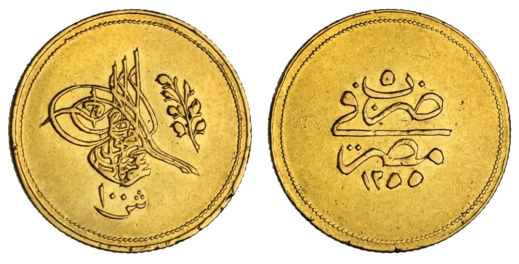 Egypt. Ottoman. `Abd al-Mejid (AH 1255-1277/1839-1861 AD). 100 'Irsh, Misr, accession AH 1255, year 5. Toughra, floral ornament, value below, beaded border on reverse. Fr.5, KM 235.1. Some tiny edge nicks. Very Fine.