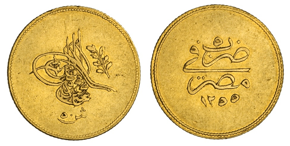 Egypt. Ottoman. `Abd al-Mejid (AH 1255-1277/1839-1861 AD). 50 'Irsh, Misr, accession AH 1255, year 5. Toughra, floral ornament, value below, rev. Year, mint and date, beaded border. KM 234.1. Very scarce. Small scratch upper obverse. Very Fine.