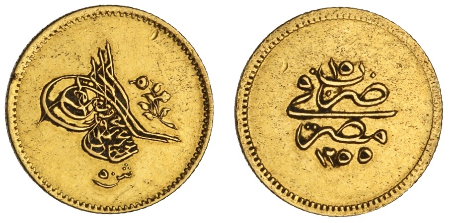 Egypt. Ottoman. `Abd al-Mejid (AH 1255-1277/1839-1861 AD). 50 'Irsh, Misr, accession AH 1255, year 15. Toughra, floral ornament, value below, rev. Year, mint and date, toothed border. Fr.6, KM 234.2. Very scarce. Once lightly polished, tiny obverse dig. Good Very Fine.