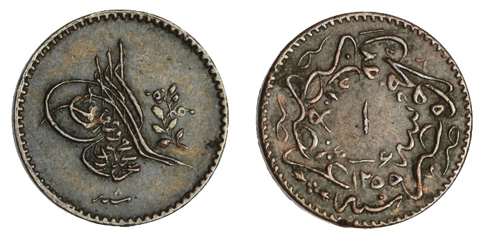 Egypt. Ottoman. `Abd al-Mejid (AH 1255-1277/ 1839-1861 AD). AE Para, Misr, accession AH 1255, year 8. Toughra, flower on stem before, rev. Numeral value, legend around. KM 221. One year-type, apparently never released into circulation. Very rare. Small scratch obverse field breaks patina. Extremely Fine.