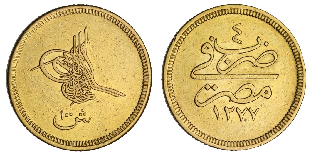 Egypt. Ottoman. `Abd al-`Aziz (AH 1277-1293/1861-1876 AD). 100 'Irsh, accession AH 1277, year 4. Paris mint. Toughra, value below, rev. Year, date and duriba fi misr. KM 264. Rare one-year type. Obverse contact marks. Very Fine.