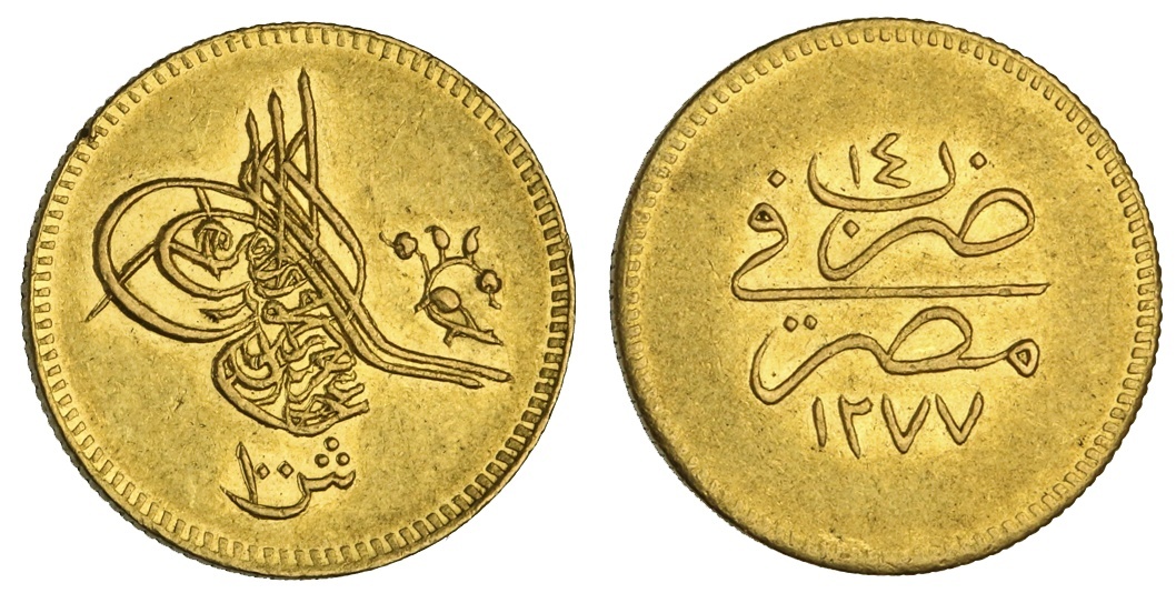 Egypt. Ottoman. `Abd al-`Aziz (AH 1277-1293/1861-1876 AD). 100 'Irsh, Misr, accession AH 1277, year 14. Toughra, floral ornament before. Fr.11, KM 263. Scarce date. Tiny obverse rim nick. Decent amount of original lustre. Extremely Fine.