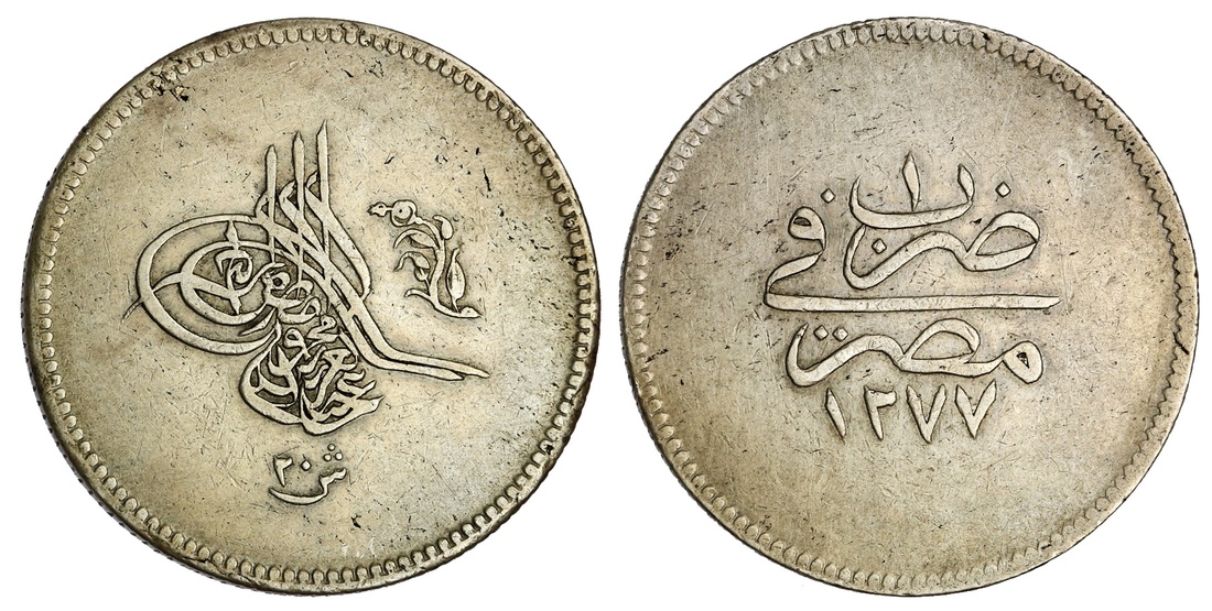 Egypt. Ottoman. `Abd al-`Aziz (AH 1277-1293/1861-1876 AD). 20 'Irsh, Misr, accession AH 1277, year 1. Toughra, floral ornament before, value below, rev. Year, mint and date. KM 260. Rare. Very Fine.