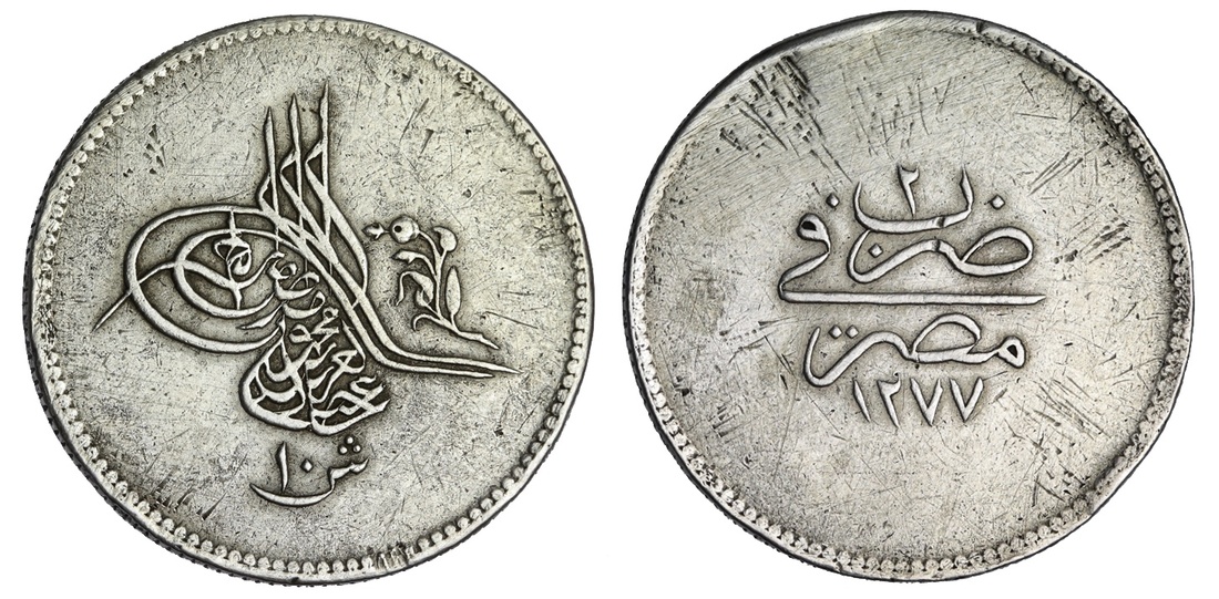 Egypt. Ottoman. `Abd al-`Aziz (AH 1277-1293/1861-1876 AD). 10 'Irsh, Misr, accession AH 1277, year 2. Toughra, floral ornament before, value below, rev. Year, mint and date. KM 256. Old scratches in fields. Very Fine.