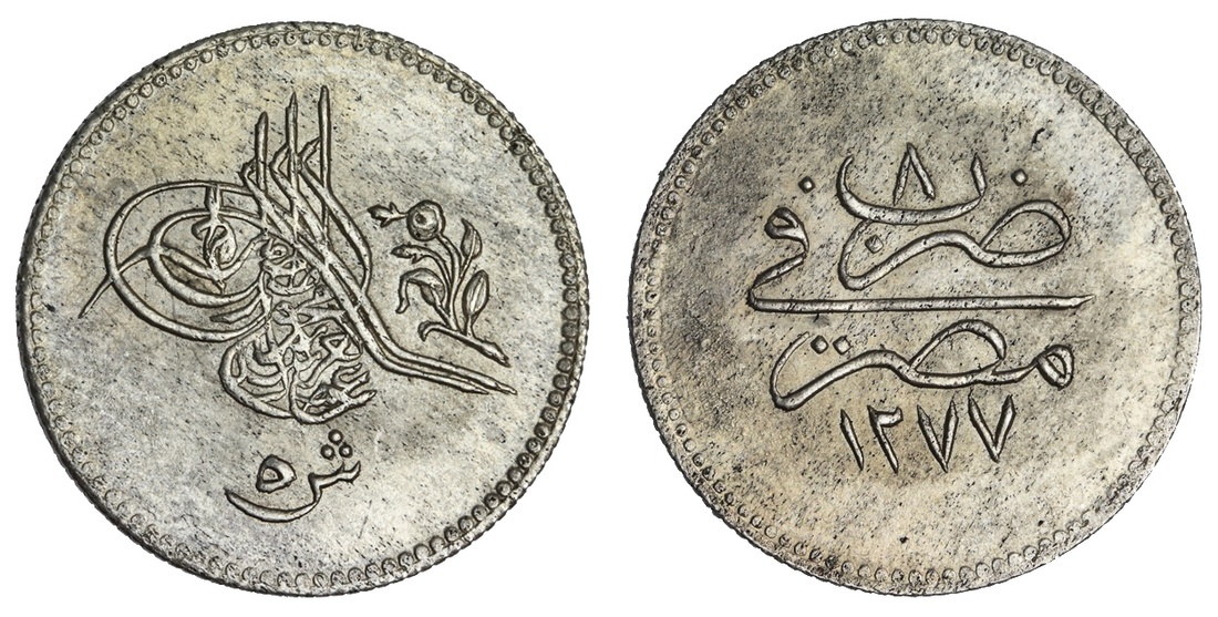 Egypt. Ottoman. `Abd al-`Aziz (AH 1277-1293/1861-1876 AD). 5 'Irsh, Misr, accession AH 1277, year 8. Toughra, rose on stem before, value below, rev. Year, mint and date. KM 254. Rare. Good amount of original lustre. Extremely Fine. A pleasing example.