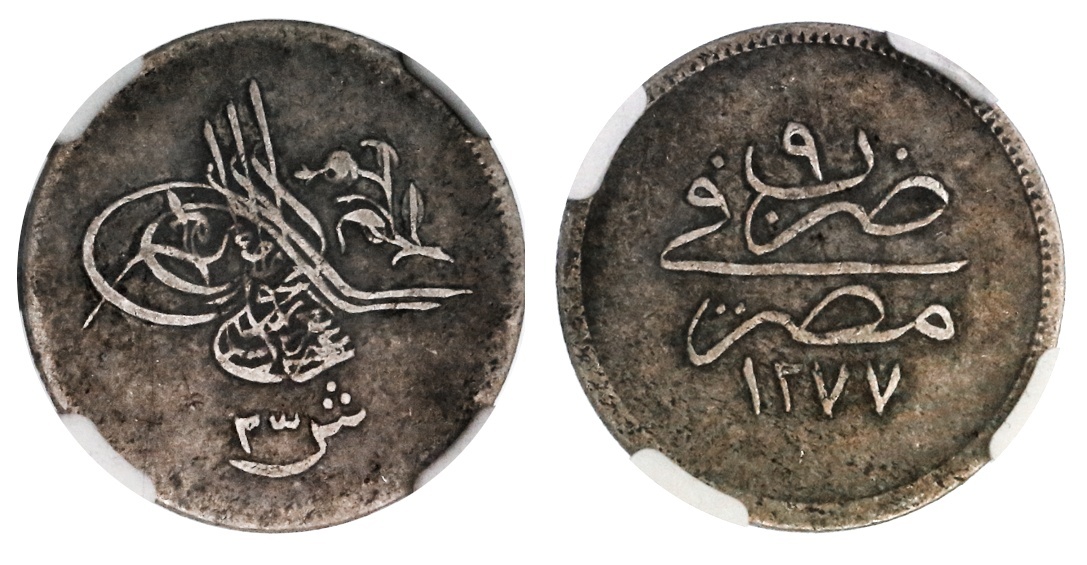 Egypt. Ottoman. `Abd al-`Aziz (AH 1277-1293/1861-1876 AD). 2 ½ 'Irsh, Misr, accession AH 1277, year 9. Toughra, flower before, value below. KM 252. Very scarce, short-lived denomination. NGC VF 20.