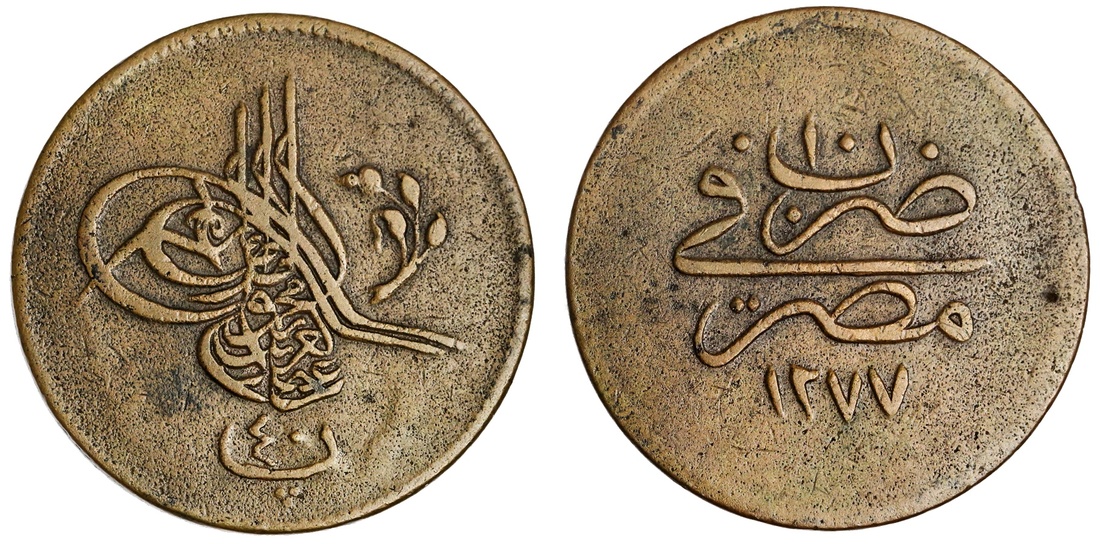 Egypt. Ottoman. `Abd al-`Aziz (AH 1277-1293/1861-1876 AD). 40 Para, Misr, accession AH 1277, year 10. Toughra, rose on stem before, value below. KM 249. Rare. Surface porosity. Very Fine.