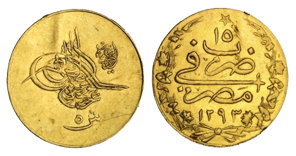 Egypt. Ottoman. `Abd al-Hamid II (AH 1293-1327/1876-1909 AD). Gold 5 'Irsh, Misr, accession AH 1293, year 15. Toughra, al-ghazi before, value below, rev. Year, mint and date within floral wreath with stars, star above. KM A299. Very scarce. Pressmark in reverse field, otherwise Extremely Fine.