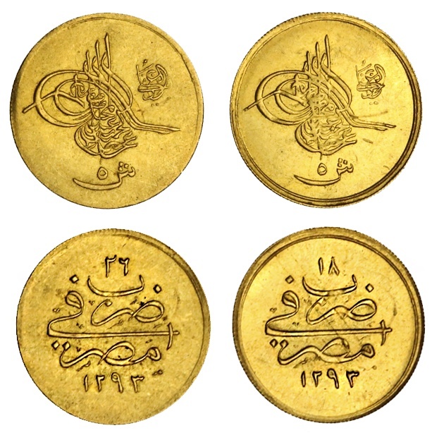 Egypt. Ottoman. `Abd al-Hamid II (AH 1293-1327/1876-1909 AD). Pair of Gold 5 'Irsh, Misr, accession AH 1293, years 18 and 26. Toughra, al-ghazi before, rev. Year, mint and date. KM 298. Very scarce. Uncirculated and Extremely Fine. (2)