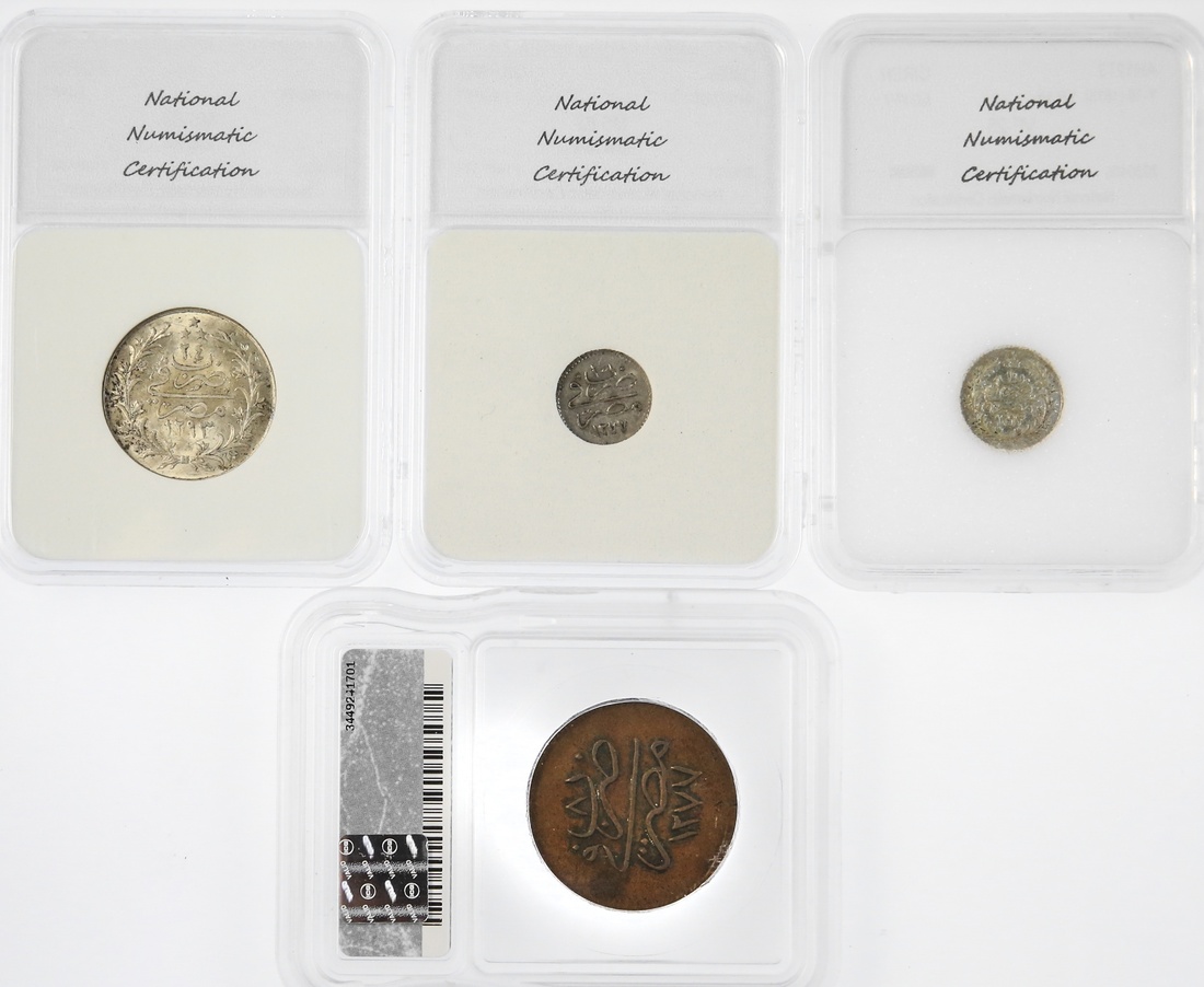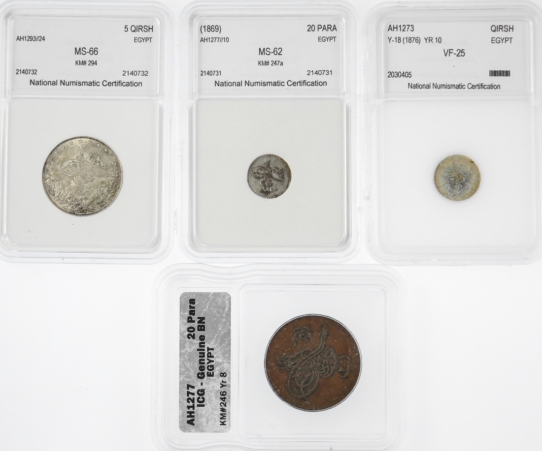 Egypt. Ottoman. Quartet of encapsulated coins: Silver 20 Para, AH 1277, year 10. KM 247a. NNC MS 62; AE 20 Para, AH 1277, year 8. KM 246. About VF. ICG - Genuine BN; 5 'Irsh, AH 1293, year 24. KM 294. NNC MS 66; 'irsh, AH 1293, year 10. KM 292. NNC VF 25. (4)