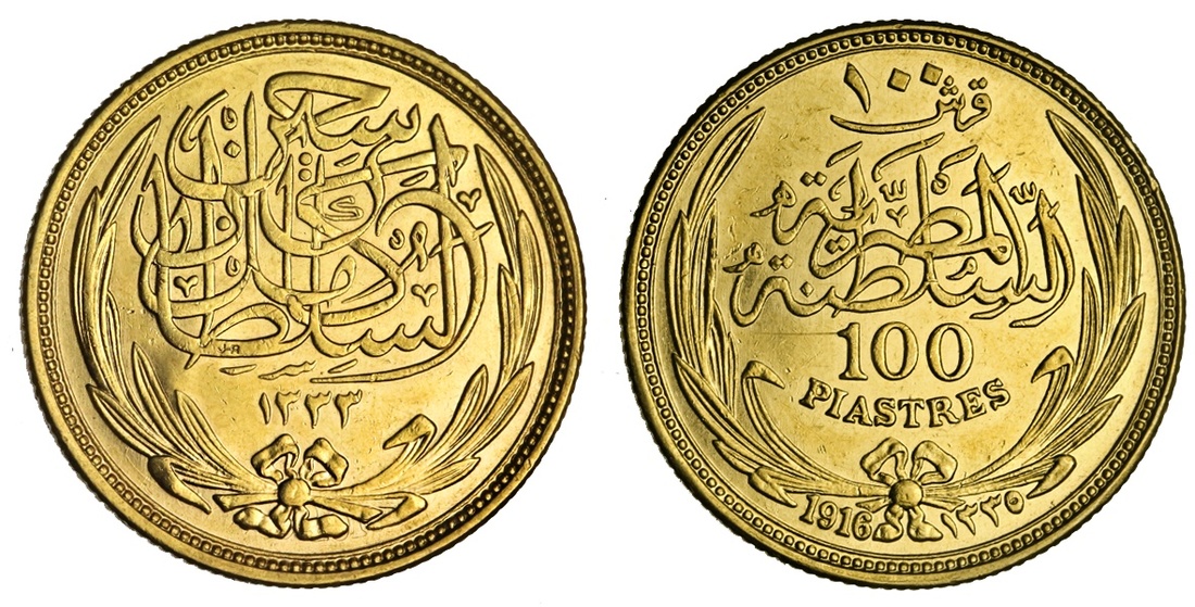 Egypt. British Protectorate. Hussein Kamil, as Sultan (AH 1333-1336/1914-1917 AD). 100 Piastres, AH 1335 - 1916. Sultan Hussein legend, accession date below, in spray, rev. Within open wreath: al-Sultanat Misriya and value in Arabic and English. Fr.24, KM 324. Once wiped, hairlines in fields. About Uncirculated.