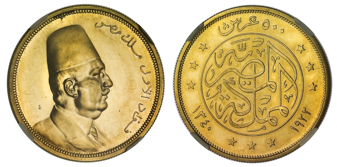 Egypt. Malik Fuad I (AH 1341-1355/1922-1936 AD). Proof 500 'Irsh, AH 1340 - 1922. Yellow gold. King's bust in civilian attire right, wearing tarboosh, rev. Within central circle: al-mamlaka al-misriya. Fr.26, KM 342. NGC PF 62. Meticulous types in reflective fields, a Choice example and conservatively graded.