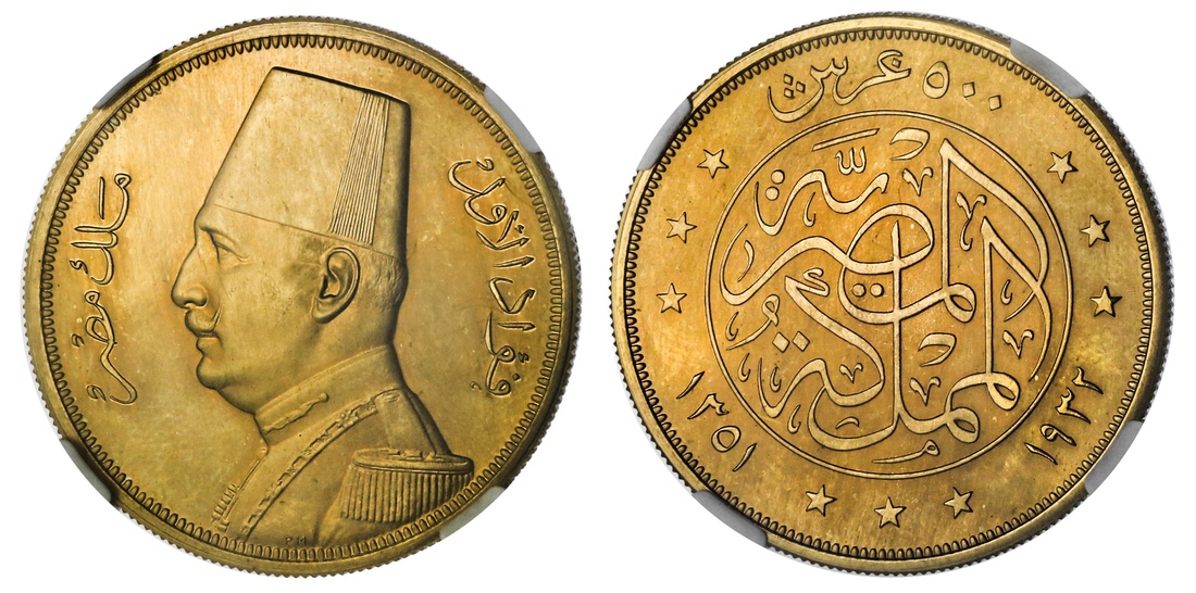 Egypt. Malik Fuad I (AH 1341-1355/1922-1936 AD). Proof 500 'Irsh, AH 1351 - 1932. King's bust left, in military attire, wearing tarboosh, rev. Within central circle: al-mamlaka al-misriya. Fr.31, KM 355. NGC PF 63. Very attractive.
