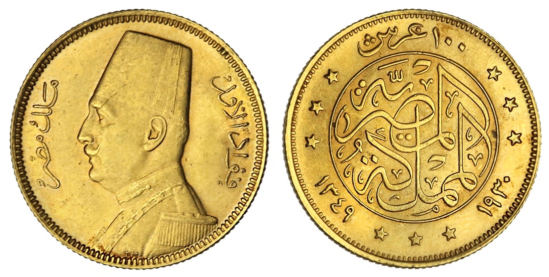 Egypt. Malik Fuad I (AH 1341-1355/1922-1936 AD). 100 'Irsh, AH 1349 - 1930. King's bust left in military attire, wearing tarboosh, rev. Within central circle: al-mamlaka al-misriya. Fr.32, KM 354. About Extremely Fine.