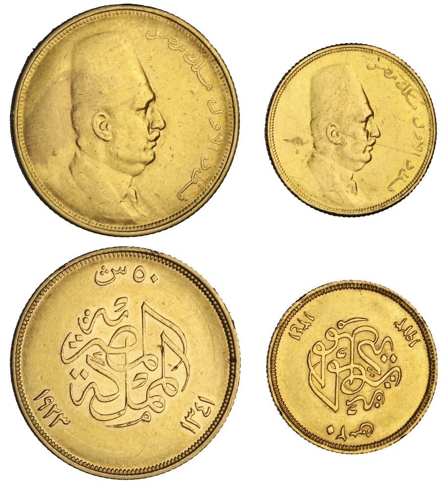 Egypt. Malik Fuad I (AH 1341-1355/1922-1936 AD). Gold pair - 20 and 50 'Irsh, AH 1341 - 1923. Civilian bust right wearing tarboosh. KM 339, 340. (2). Both have been polished, excessive obverse hairlines. About Extremely Fine. (2)