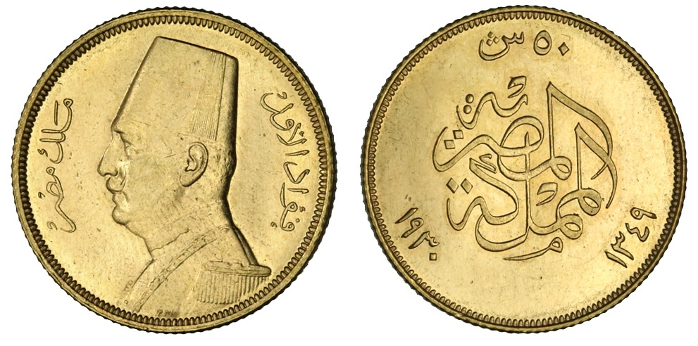Egypt. Malik Fuad I (AH 1341-1355/1922-1936 AD). 50 'Irsh, AH 1349 - 1930. King's bust left in military attire, wearing tarboosh, rev. Within central circle: al-mamlaka al-misriya. Fr.33, KM 353. Hairlines behind bust. Uncirculated.