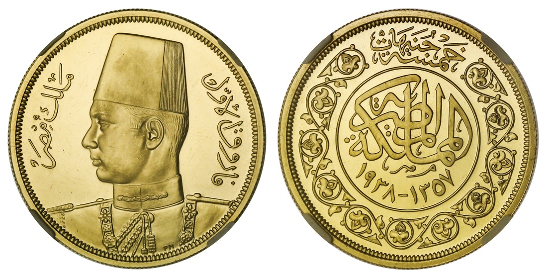 Egypt. Malik Farouk (AH 1355-1372). 500 'Irsh (5 Gin'eha), AH 1357 - 1938. On the Marriage of King Farouk and Farida (Safinaz Zulficar). Uniformed bust of the young king left wearing a tarboosh, rev. Within circle: al-mamlaka al-Misriya and dates, decorative vine around and value khamsa gin'eha above. Fr.35, KM 373. Safinaz Zulficar, who came from a prominent kirkazi (Turko-Circassian) family, was renamed Farida in accordance with the tradition begun by King Fuad in which all the names of the members of the royal family begin with the same letter. Farida bore Farouk three daughters - Farial, Fawzia and Fadia, but, unfortunately, was never able to give him the male heir he sought. The couple divorced in 1948. NGC PF 64 Cameo. Deeply mirrored surfaces well cameo frosted types. An impressive coin, and very scarce so nice. Ex Heritage Auctions, Jan. 6-7, 2013, lot 20504.